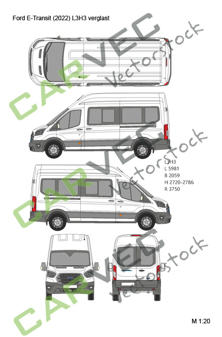 Disegno vettoriale Ford E-Transit L3H3 verglast (2022)